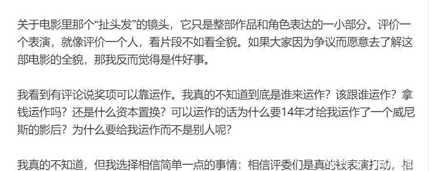 她还解释了那个关于电影里扯头发的场景,基本意思就是别只看一个片段就去评价一个人,要把整个剧情都看完才行。